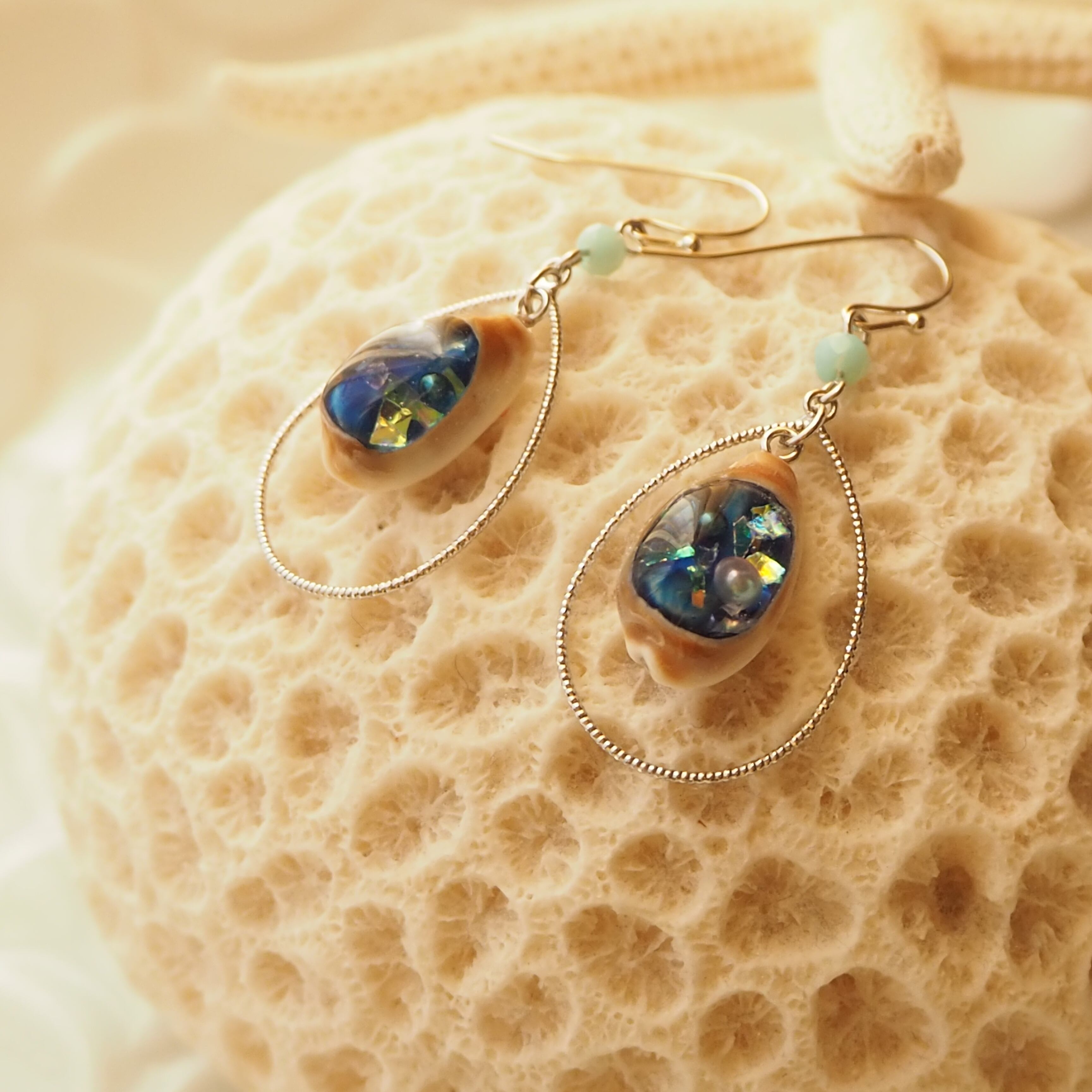 チビチビタカラガイをカットし、レジンで海を作りました。