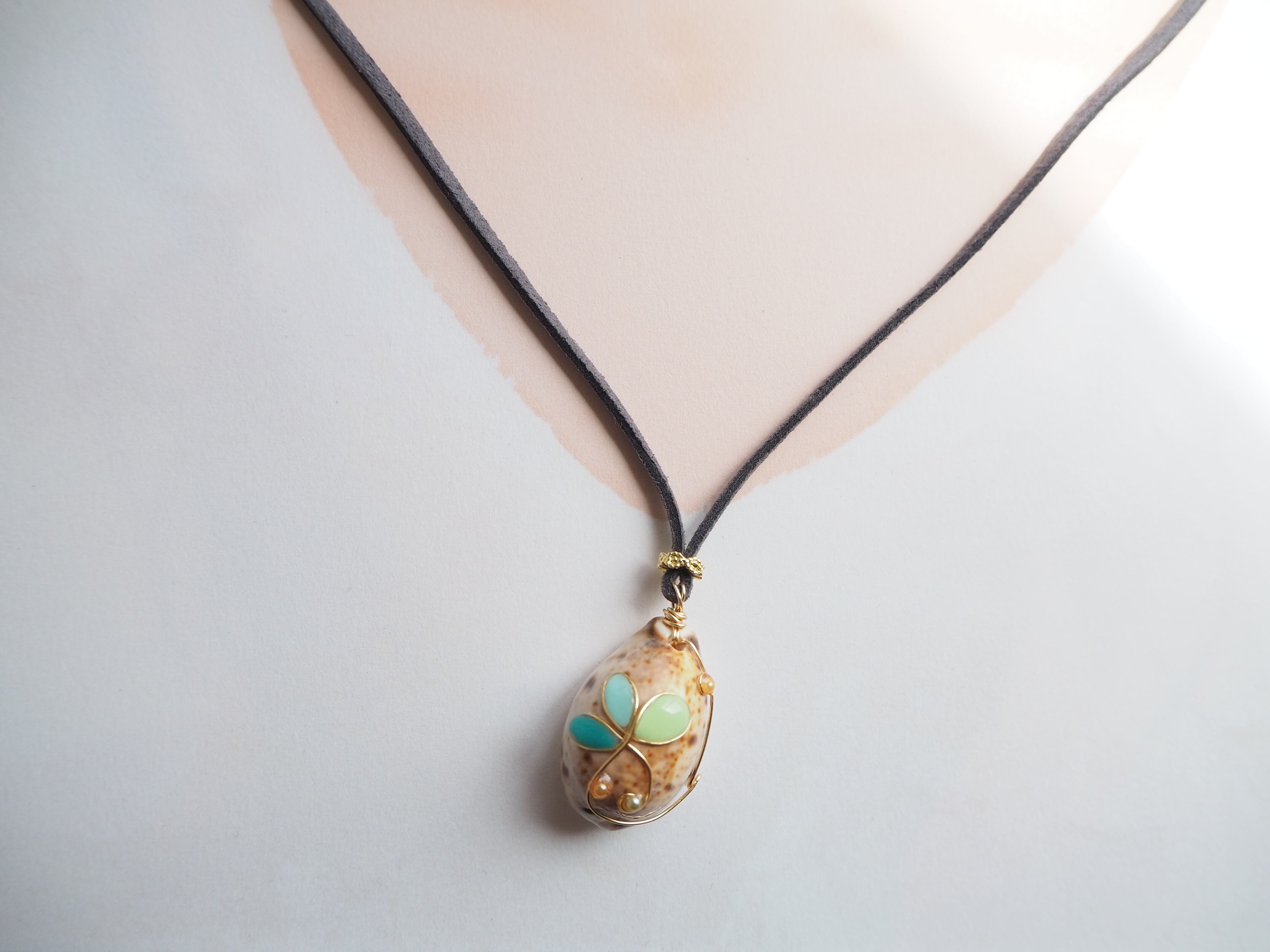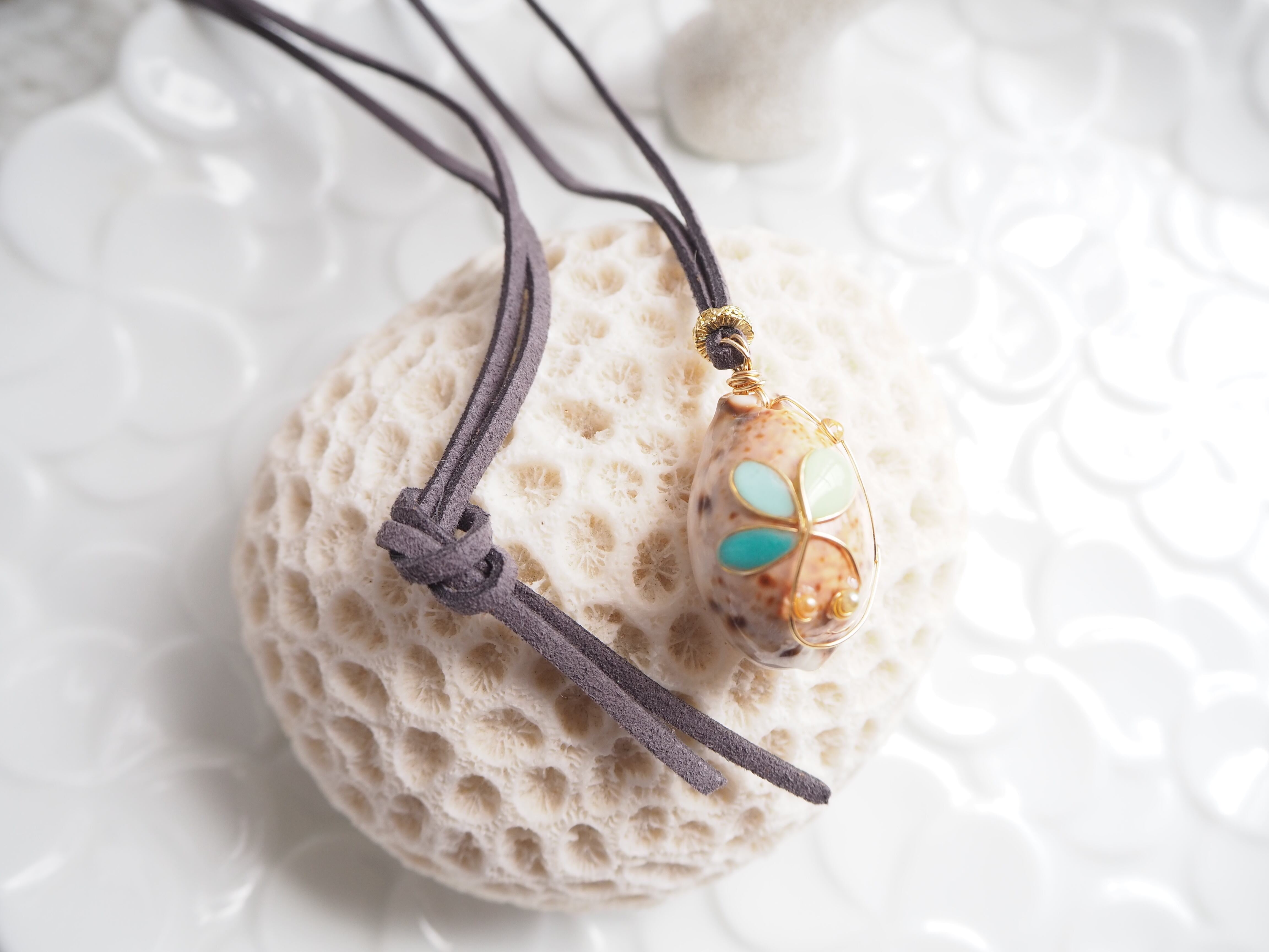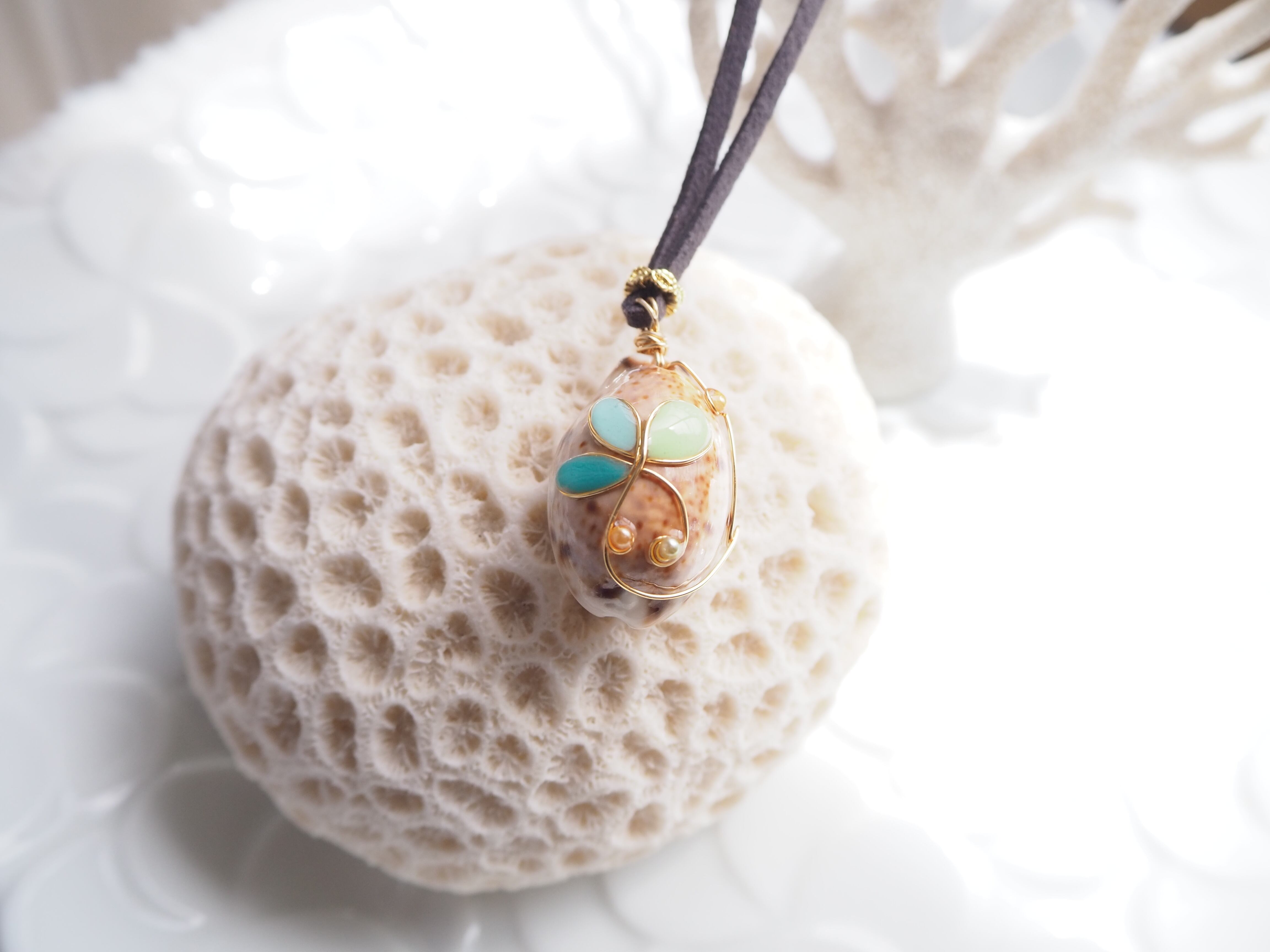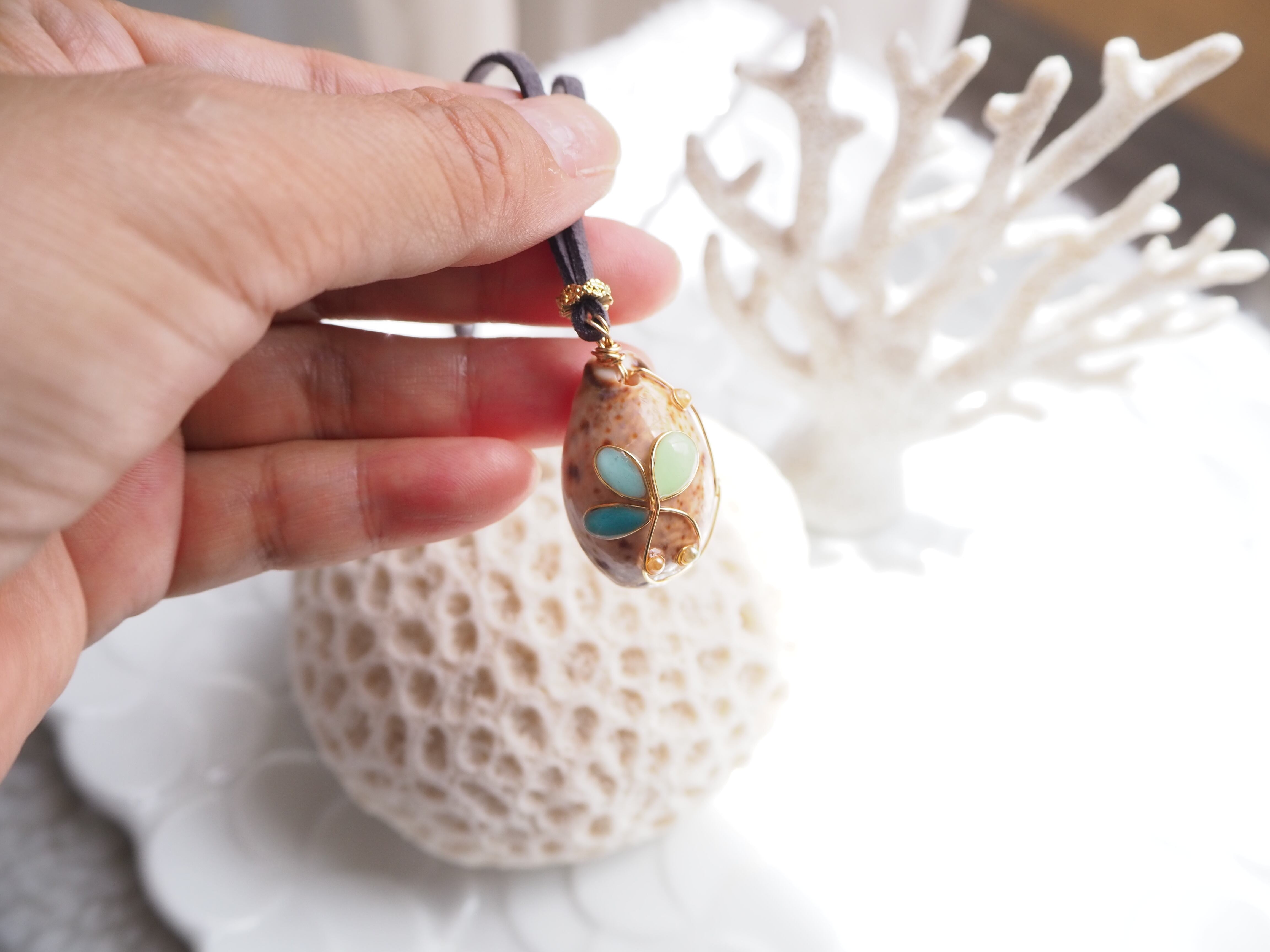 ベージュのタカラガイにグリーンの色をつけて、こげ茶の紐で引き締めました。